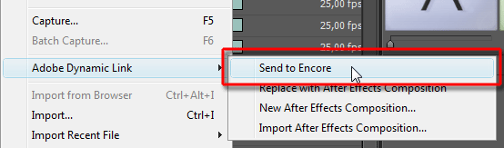 Чтобы весь смонтированный фильм перенести в Adobe Encore, воспользуемся командой File -> Adobe Dynamic Link -> Send to Encore.