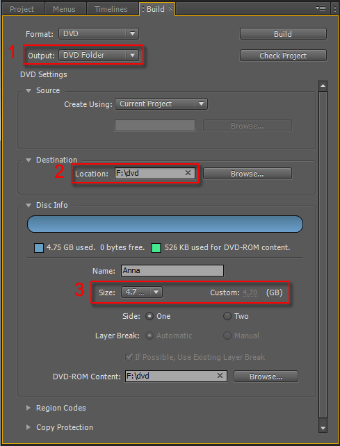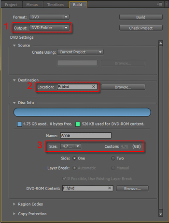 Переходим к созданию DVD-диска. Откройте вкладку Build (F2), здесь необходимо изменить некоторые настройки. Во-первых, не следует сразу записывать DVD на оптический носитель (если вы, конечно, не уверены на 100% в правильности своих действий). Разумнее предварительно создать папку с файлами DVD-видео, для чего в строке Output (1) следует выбрать пункт "DVD Folder". Следующий шаг — выбор папки на жестком диске, где будут созданы эти файлы (2). И нужно не забыть определиться с ёмкостью оптического носителя, куда вы планируете в дальнейшем записать готовый диск (3).