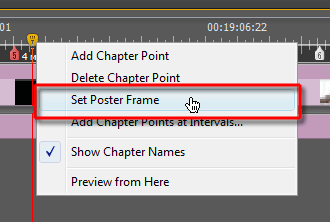 Теперь, не сдвигая курсора, нажмите правую кнопку мыши и выберите из выпадающего меню команду Set Poster Frame. Тем самым мы присвоим метке главы тот кадр, на котором в данный момент стоит ползунок таймлинии.