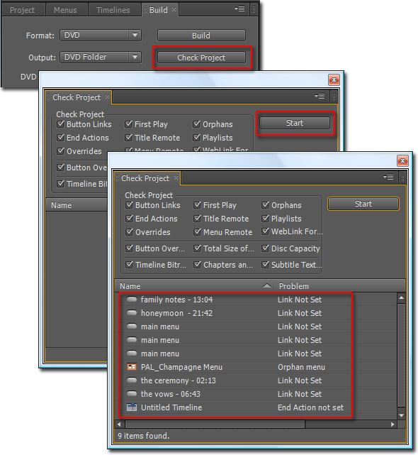 Прервем ненадолго создание диска, и устроим нашему проекту настоящее испытание: отдадим его на растерзание встроенному в Encore модулю поиска ошибок. Данный модуль запускается кнопкой со скромным названием Check Project, находящейся во вкладке Build. По нажатию этой кнопки появится окно, где пользователь может отметить флажками нужные ему пункты, а лучше оставить всё так, как есть (по умолчанию активированы все пункты).