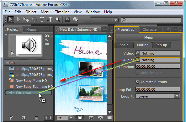 А где видео — там без звука никуда! Озвучим наше меню. Импортируем в копилку проекта подходящую композицию (продолжительность композиции должна составлять те же 30 секунд, в противном случае, длительность анимации меню изменится, сравнявшись с длительностью музыки). Теперь, зацепив кнопку с пиктограммой спирали, перетяните курсор мыши на импортированную музыкальную композицию и отпустите кнопку мыши. Теперь меню озвучено.