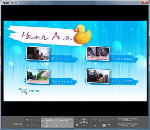 Теперь, кажется, всё в порядке. Стоит проверить работоспособность ссылок, вдруг где-то допущена ошибка. Нажмите Ctrl+Alt+Space, либо, щелкнув по окну редактирования меню правой кнопкой мыши, выберите из выпадающего меню команду Preview from Here. Откроется окно плеера, где созданное нами меню ведет себя так же, как оно будет себя вести при воспроизведении на обыкновенном DVD-проигрывателе. Пощёлкайте по ссылкам, проверьте, не наползают ли какие-либо объекты друг на друга при их активации.