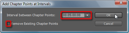 Этот интервал выставляется вручную, по умолчанию он составляет оптимальные 5 минут. Если отметить флажком пункт Remove Existing Chapter Points, то при этом все существующие в проекте метки глав будут удалены, их заменят созданные через выбранный интервал.