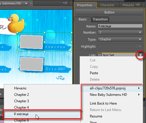 Хорошо, с первым меню разобрались. Щелкнем для редактирования по второму меню в копилке проекта. Здесь тоже требуется изменить текст, а впоследствии расставить ссылки. Изменить текст — не проблема, но со ссылками снова следует быть аккуратнее. Выделим в меню, например, кнопку с названием "4 месяца" — ссылка, которую следует присвоить данной кнопке, будет следующей: