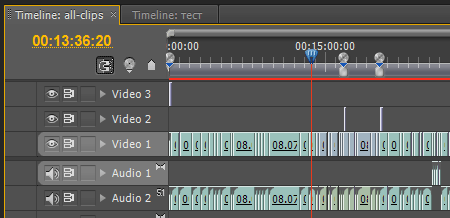 Чтобы начать работу с таймлинией, дважды щелкните по строчке Timeline в копилке проекта. Таймлиния развернется в нижнем поле, представляя собой один-единственный клип. Однако, как мы видим, метки глав, которые были расставлены ещё при монтаже в Premiere Pro, никуда не делись — они находятся в верхней части таймлинии.