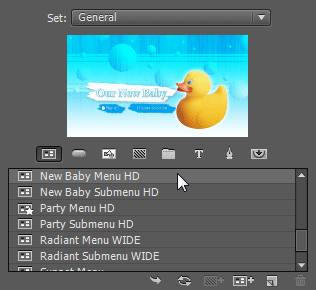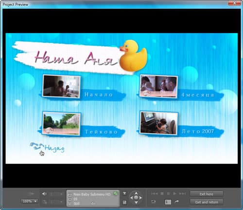 В нашем случае вполне подойдет шаблон New Baby... Пусть вас не смущает буквосочетание HD (High Definition) в названии шаблона, все равно при создании обычного SD DVD размеры меню пересчитаются автоматически вместе с видеоматериалом.