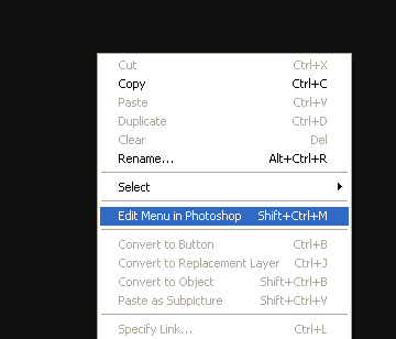 Далее в пустом месте меню щелкните правой кнопкой мыши и в появившемся окне выберите пункт Edit menu in Photoshop. Данный вариант создания меню требует некоторых знаний этого мощного графического пакета.