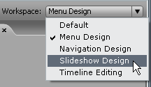 Обратите внимание на интерфейс программы, или, как его называют разработчики рабочее пространство (Workspace). Очень удобна возможность смены рабочего пространства в зависимости от типа работы. Например, при создании слайд-шоу рабочее пространство легко трансформировать именно для этой цели. Достаточно лишь нажать стрелку в правом верхнем углу программного окна напротив слова workspace и выбрать пункт SlideShow Design.