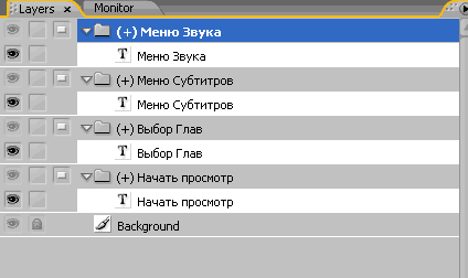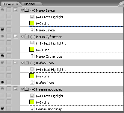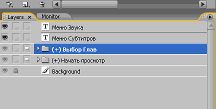 Сохраните этот файл, как было сказано выше, и в Encore вы получите тот же результат, что и в Photoshop. Далее сделайте так, чтобы каждый пункт меню подчеркивался. Для этого перейдите в Encore и измените рабочую область (workspace) на Menu Design, как было описано выше. В левой части Encore вы увидите окно Layers.