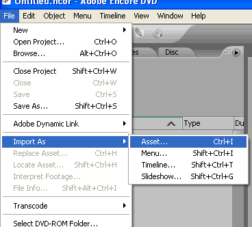 Импортирование в режиме As assets — это обычное импортирование любых файлов, поддерживаемых программой, в результате такой операции выбранные файлы появятся в окне Project. Если вы выберете пункт меню As menu, то у вас будет возможность выбрать только файлы, связанные с созданием меню, например, картинки. Пункт As timeline позволит вам выбрать только видеофайлы, поддерживаемые программой, однако в окне Project, помимо самих файлов, появится еще и новая таймлиния, уже содержащая в себе выбранные файлы. Кстати, создание таймлинии (временной линейки — Timeline) можно проделать и после того, как файлы будут импортированы. И последнее - это Slideshow. Несложно догадаться о результате выполнения этой команды.