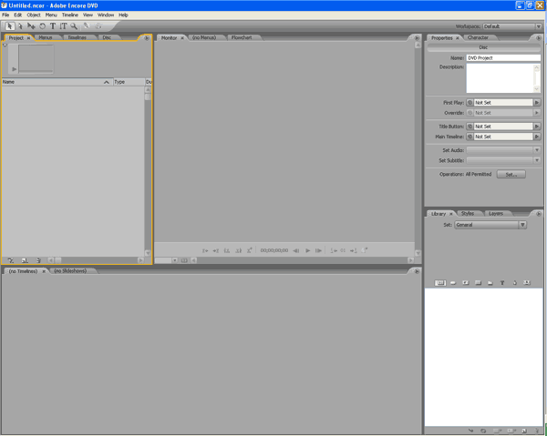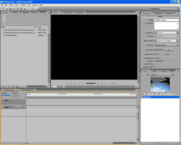 Под панелью инструментов находится группа окон Project, Menus, Timelines, Disc. В этой группе окон впоследствии будут отображаться файлы, использованные в проекте, а также созданные вами меню и таймлинии. По центру экрана находится следующая группа, включающая в себя объекты Monitor, (No menus), Flowchart. Эта группа поможет вам работать с файлами, то есть видеть, например, в каком месте клипа вы находитесь в данный момент, а также создавать меню и просмотреть схему организации ссылок вашего DVD. Под этими двумя группами находится окно с будущей таймлинией для видео и слайд-шоу. Две группы окон справа позволят вам задать свойства проекта или отдельного меню, выбрать нужный шрифт, использовать стили, слои. Здесь же находится библиотека, в которую можно добавлять собственные графические файлы.