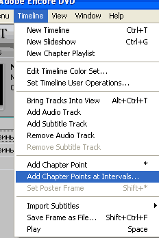 Далее простым переносом, удерживая левую кнопку мыши, перенесите нужные файлы на таймлинию. Если у вас несколько фильмов, то вы можете сделать несколько таймлиний, отдельно под каждый фильм, или перенести все на одну таймлинию, расположив клипы последовательно, друг за другом. Во втором случае Encore DVD автоматически расставит главы в начале каждого фильма (клипа). Обратите внимание на пример в данной статье. Здесь используется один-единственный клип, поэтому расставлять главы придется самому. Как это делается? В Encore существует 2 способа расстановки глав, первый — автоматическая расстановка, второй — ручная. Для создания глав автоматически нажмите в главном меню Timeline -> Add chapters at intervals…