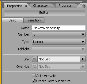 Теперь немного отвлекитесь от Adobe Photoshop и вернитесь в Encore. Сделайте ссылки на ваши готовые надписи. Выделите кнопку (уже кнопку) "Начать просмотр". Обратите внимание на окно свойств: