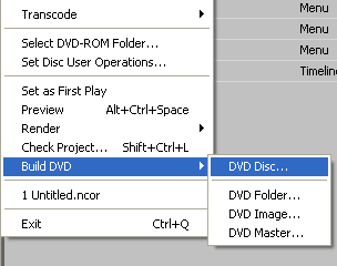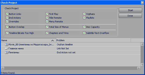 Нажмите кнопку Start у вас наверняка появились сообщения об ошибках. Исправив все ошибки, например, проставив недостающие ссылки, можно приступать к компиляции проекта. Encore позволяет создать папку с файлами DVD-видео, образ диска, или сразу записать на DVD-диск. Для этого щелкните File->Build DVD-> и по вашему усмотрению выберите подходящее действие.