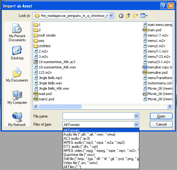 По умолчанию в строке Files of Type стоит значение All formats, однако щелкните по стрелке вниз, и вы увидите расширения файлов, поддерживаемые программой. Большой список. Можно порадоваться за предоставленную разработчиком программы возможность работать с таким количеством разнообразных файлов, без предварительной их обработки. К сожалению, работа с файлами AVI и WMV поддерживается лишь в том случае, если размер изображения видео составляет 720*576 или 704*576 (это относится ко всем типам файлов).