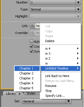 В данном окне вы видите имя кнопки, второе поле это номер кнопки, третье ее тип, его не трогаем. Далее видна неактивная кнопка Highlight. Как раз эта строка и отвечает за цвета подсветки, исчезновение объектов и т.д. Она неактивна по причине того, что в проекте по умолчанию стоит автоматический выбор цветов. Об этом чуть позже. Обратите внимание на строку Link (ссылка). Нажмите на стрелку и выберите мышкой нужную ссылку. Так, для кнопки "Начать просмотр" выберите первую главу фильма Chapter 1.