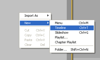 Теперь у вас есть набор файлов для будущего DVD, следующая задача — разбить на логические части ваш фильм (или фильмы). Данная задача называется созданием глав (Chapters). Чтобы создать главы, сначала необходимо создать Timeline (временную линейку). Для этого нажмите правой кнопкой мыши в пустом месте окна Project и выберите New->Timeline.