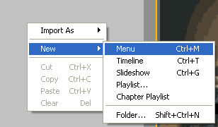Если в вашем распоряжении имеется несколько клипов или один клип с расставленными с главами, то вам необходимо создать "центр управления" вашим диском меню. Для начала нужно создать пустое меню: в пустом месте окна Project щелкните правой кнопкой мыши и выберите New->Menu.
