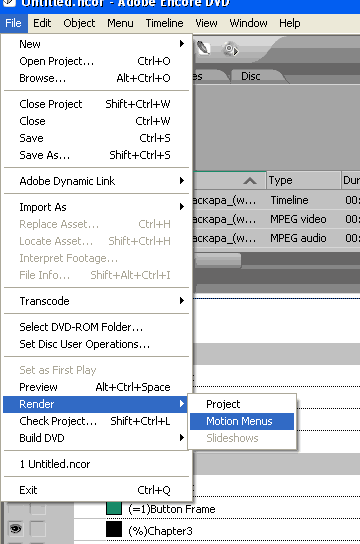 Верхние строки Video и Audio относятся к Background video и audio, то есть к фоновым видео и аудио. Теперь вы должны просчитать (отрендерить) готовое меню. Нажмите File->Render->Motion Menus.