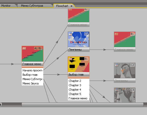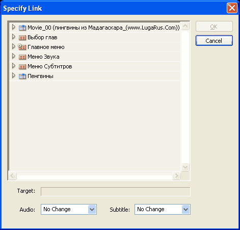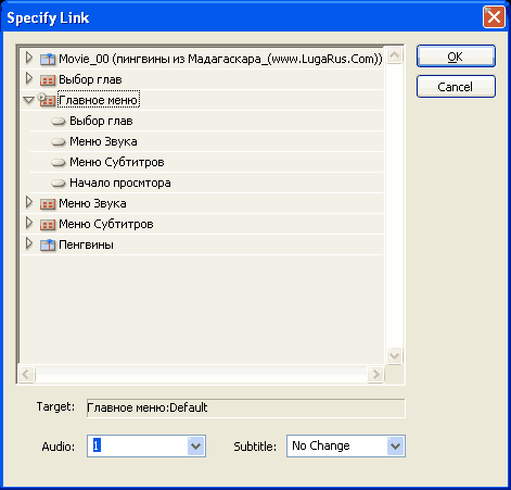 Кнопке "Субтитры 1" нужно присвоить ссылку на трек1 и на Главное меню, кнопке "Субтитры 2" на трек2 и Главное меню, ну а кнопке "Off", соответственно Off и опять же Главное меню. Итак, в строке Link окна свойств должны появиться символы S1 и S2. Настройка субтитров готова.
