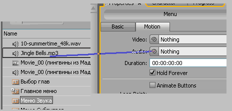 Выполните вторую часть задачи, а именно: к меню звука добавьте фоновую музыку. Для этого щелкните по меню звука кнопкой мыши и в окне свойств перейдите во вкладку Motion. Как уже говорилось выше, в данной вкладке присутствуют две строки: Audio и Video. Щелкните и удерживайте левой кнопкой мыши значок рядом со строкой Audio и перетяните мышь на требуемый звуковой файл.
