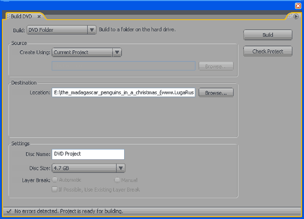 Нажмите кнопку Start, и у вас могут появиться сообщения об ошибках. Исправив все ошибки, например проставив недостающие ссылки, можно приступать к компиляции проекта. Encore позволяет создать папку с файлами DVD-видео, образ диска, или сразу записать диск. Для этого щелкните File->Build DVD->, далее выберите подходящее действие по вашему усмотрению.