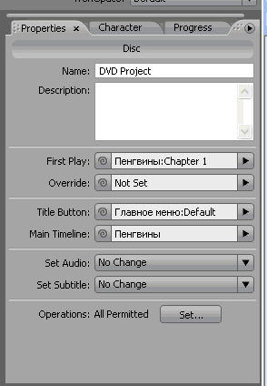 Если сразу после запуска у вас начал проигрываться фильм не расстраивайтесь! Это произошло потому, что в свойствах диска первым заданием стоит проигрывать диск. Для того, чтобы это проверить, щелкните в пустом месте окна Project левой кнопкой и обратите внимание на окно свойств диска.