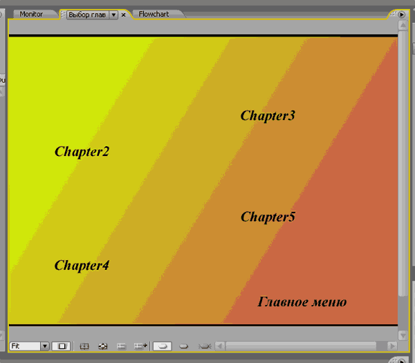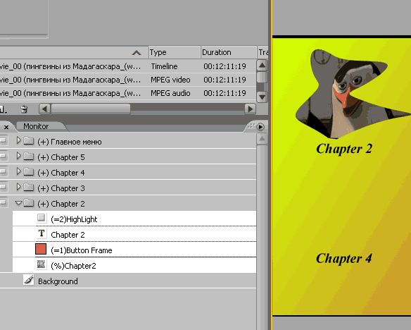 Назовите его (=1)Button Frame, далее создайте третий слой и назовите его (=2)HighLight. Перейдите в Encore и присвойте кнопке ссылку на Chapter 2. Вместо фигуры должен появиться фрагмент фильма. И, если вы правильно выбрали Color Set Manual default и настроили цвета, у вас получится следующее: