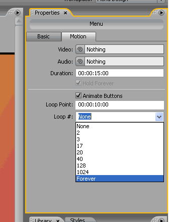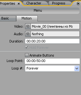 Вернитесь в Encore. Для того чтобы анимировать кнопки (заставить видео проигрываться в них), вы должны попасть в окно свойств меню, а именно во вкладку Motion.