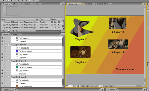 А дальше перейдите в созданное вами меню "Выбор глав", где вы сейчас создадите двигающееся меню, то есть меню с анимированными кнопками. Меню "Выбор глав" можно выбрать путем двойного щелчка левой кнопкой мыши по нему в окнах Project или Menu. Для создания оригинальных окошек нужно снова воспользоваться Photoshop. Откройте меню для редактирования в Photoshop или нажмите Shift+Сtrl+M. Создайте в Photoshop фон. Создание анимационных кнопок очень похоже на создание обычных кнопок, за исключением некоторых нюансов. Напишите названия всех глав. В примере их пять, под названиями Сhapter1 Сhapter5 (вы же можете работать с теми именами, которые вы им дали ранее). Вернитесь в Encore.