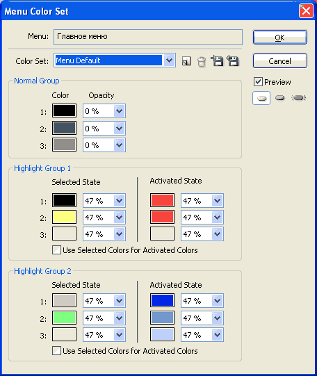 Всегда проверяйте, с каким меню вы работаете его название отображается в верхней части окна в строке Menu. Выберите в графе Color Set параметр Menu Default, это настройка, которую можно изменить, а потом, вдобавок ко всему, еще и сохранить. После того, как вы выберете Menu Default, у вас появится возможность изменять цвета. В данном окне вы видите три группы: Normal Group, Highlight group 1 и Highlight group 2. По названию несложно догадаться, что это группы цветовых настроек. Рассмотрим для примера группу Normal. Она обозначает те цвета, которые будут иметь кнопки в нормальном, не активированном и не выделенном состоянии. А вот подгруппы 1, 2, 3 обозначают тот самый Х в выражении (=Х). Рядом с цветом можно также поставить прозрачность это прозрачность цвета для текста или объекта. То есть, если прозрачность нулевая (0%), то какой бы вы цвет ни выбрали, на экране вы ничего не увидите. Далее вы видите две группы Highlight. Вообще достаточно было бы одной такой группы, вторая добавлена лишь ради того, чтобы добавить возможности при работе с цветами. В настройках же самого меню, а именно в окне Basic, вы можете выбрать в строке Color Set цветовые настройки (Automatic или Menu Default, или свои настройки, те самые, которые вы создали и сохранили).