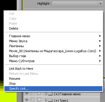Далее создайте в Photoshop для меню звука фон и несколько ссылок, а именно "Трек 1", "Трек 2", ну, и "Главное меню" (по желанию), затем вернитесь в Encore и превратите текст в кнопки. Можно также, вернувшись в Photoshop, нарисовать галочки, которые будут появляться при выборе того или иного пункта (вы это уже проделывали в предыдущих меню). Теперь нужно присвоить кнопкам ссылки, сначала сделайте это для кнопки "Главное меню". Для того, чтобы присвоить кнопке ссылку на трек, вы должны выделить кнопку и в окне выбора ссылок нажать Specify Link.