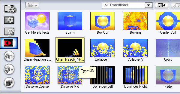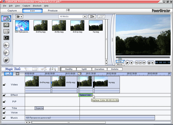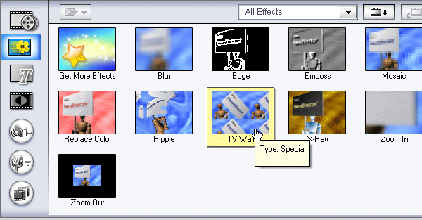 Этапы редактирования видео разбиты на категории подобно тому, как это организовано в программе Pinnacle Studio Plus X . Имеющиеся в составе программы эффекты вполне стандартны и отвечают всем требованиям любительского монтажа.