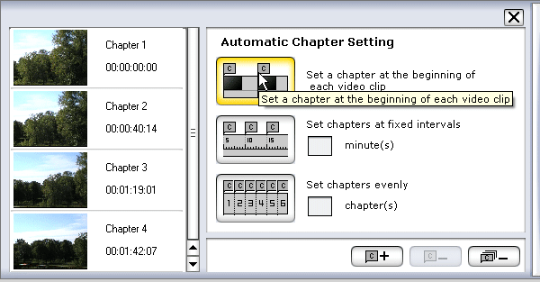 Существует возможность расстановки сцен для будущего DVD фильма, как вручную, так и автоматически.