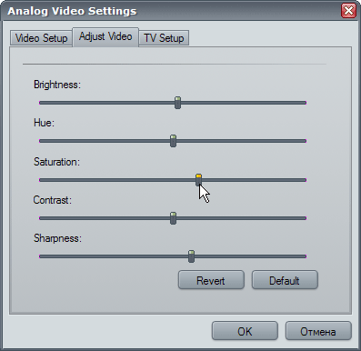 Работа в программе традиционно разделена на три этапа: захват, редактирование и вывод готового фильма. Каждый этап производится в своем окне, открываемом по нажатию соответствующей вкладки. Первая вкладка, как и следует ожидать, Capture (Захват). Здесь можно выбрать источник сигнала, папку на диске для хранения файлов проекта, и даже подстроить "на лету" некоторые параметры захватываемого видео.