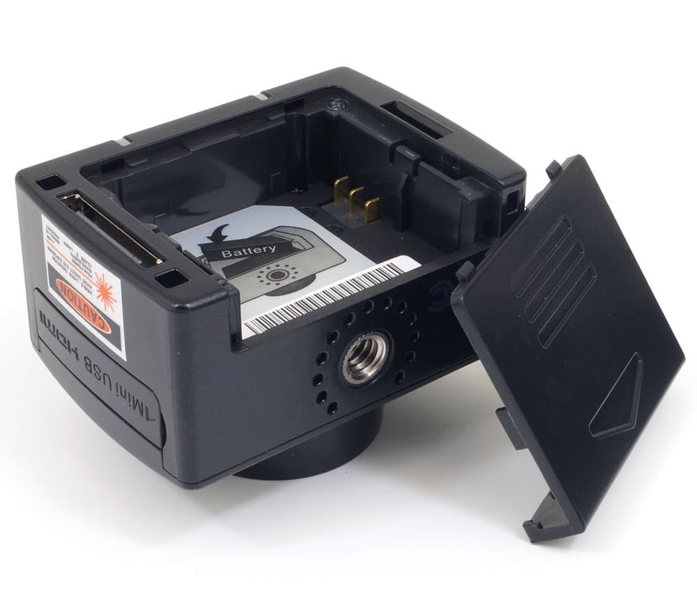Внешний съемный аккумулятор имеет такие же габариты, что и съемный блок ЖК-экрана. Таким образом, в аквабокс можно «упаковать» камеру как с подсоединенным блоком ЖК-экрана, так и с аккумулятором. Здесь пользователь должен самостоятельно решить, что ему важнее: постоянный мониторинг видео или продолжительность автономной работы.