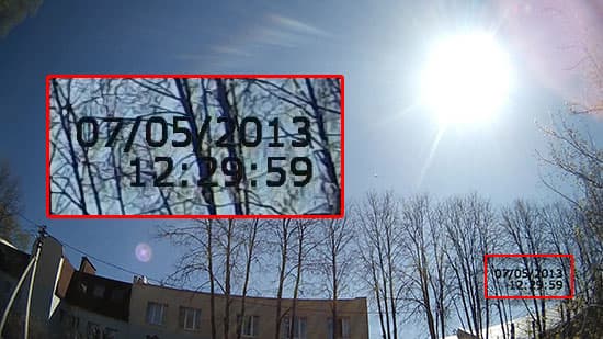 Камера по желанию пользователя впечатывает в видео текущую дату и время. Положение надписей и цвет шрифта неизменны: правый нижний угол и черный шрифт с чуть заметным белым контуром. Как показала практика, этот шрифт виден в подавляющем большинстве случаев, как поверх темных участков видео, так и, само собой, на светлом фоне.