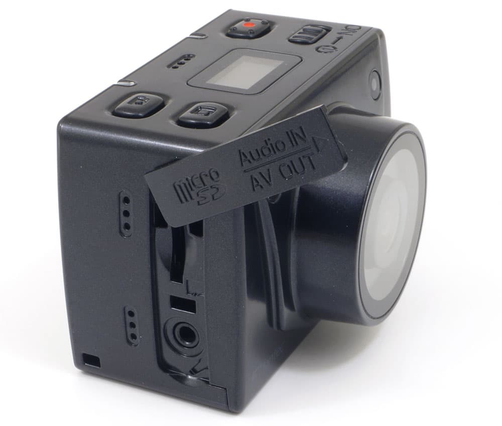 С правой стороны корпус также имеет заглушку, под ней расположены слот для карты памяти формата microSD и универсальный разъем для штекера диаметром 2,5 мм. Этот разъем служит одновременно для подключения наушников и композитного аудио/видеокабеля (используется четырехконтактный 2,5 мм джек). Но это не все: рядом с разъемом имеется пиктограмма, означающая возможность подключения внешнего микрофона. К сожалению, звук с внешнего микрофона записывается только в том случае, когда камера работает в режиме аудиорекордера.