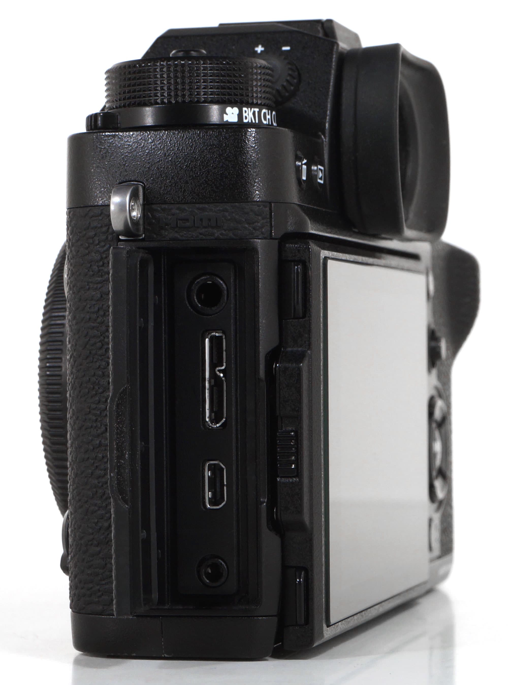 Под откидывающейся крышкой расположены в ряд следующие интерфейсы: микрофонный вход 3,5 мм, скоростной порт USB 3.0 (это уже не первый экземпляр фото/видеотехники со скоростным USB-портом — такой прогресс в сознании разработчиков безмерно радует), видеовыход Micro-HDMI и 2,5-миллиметровый разъем дистанционного спуска затвора.