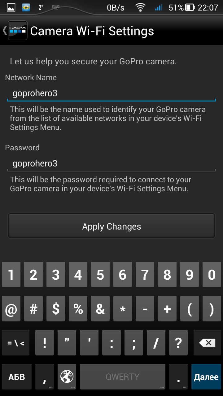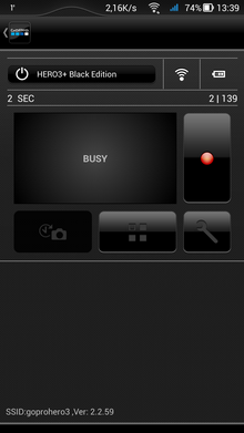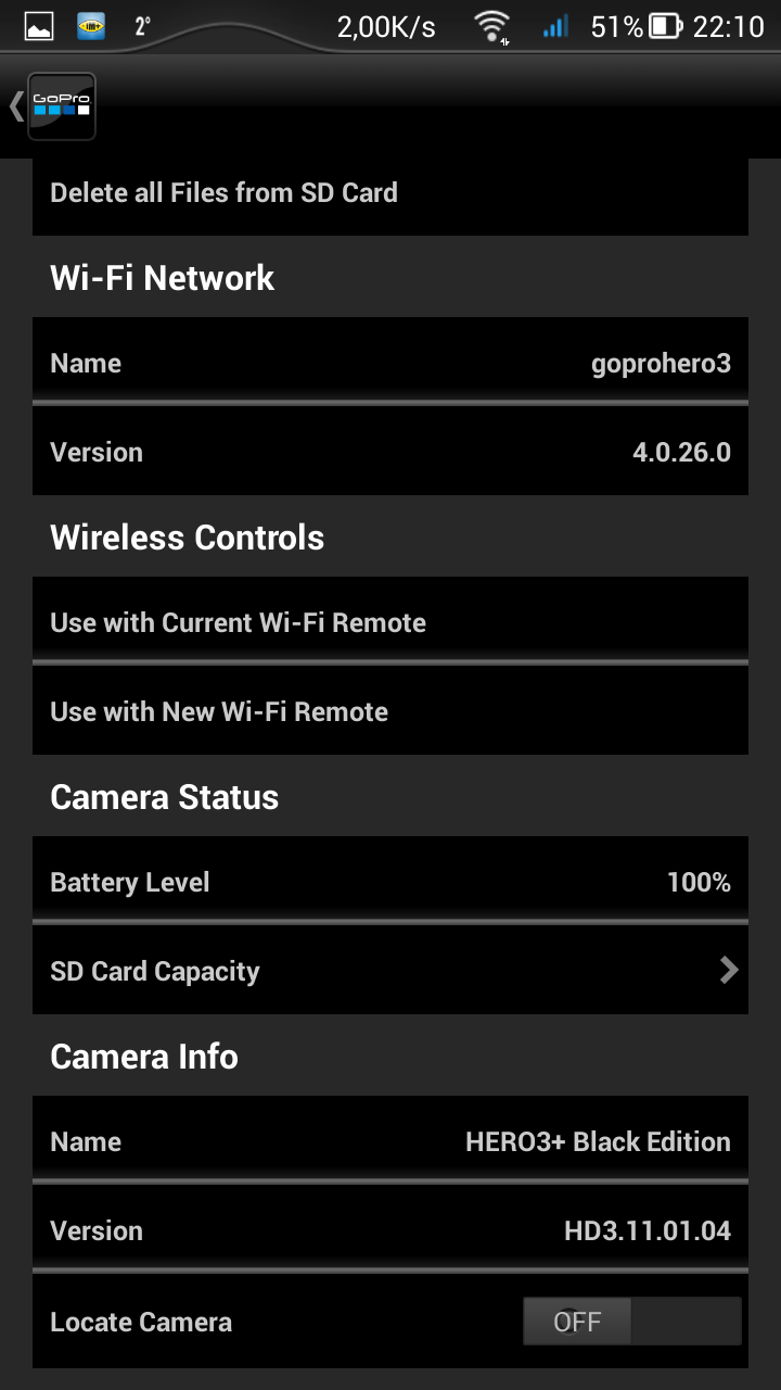 Если первые два режима не вызывают удивления, то третий — довольно спорное решение. Невнимательный пользователь может забыть о вкдлюченном Wi-Fi, либо включить его случайно, нажав на боковую кнопочку. А батарея-то не вечная... Ну зато при активированном Wi-Fi можно в любой момент подключиться к камере посредством смартфона, включить саму камеру, а вслед за этим — и запись. Интерфейс мобильного приложения выглядит аккуратно, программа отточена, не «тормозит» и не «зависает», каждый пункт расположен в соответствии с логикой. Прямая трансляция видеопотока с камеры имеет небольшую задержку в одну-две секунды.