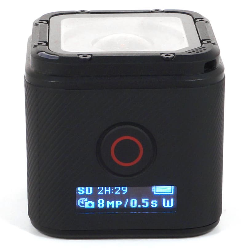 Камера оснащена двумя кнопками, главной и вспомогательной, которая имеет надпись Info/Wi-Fi. Краткое нажатие на главную кнопку пробуждает камеру, после чего автоматически включается видеозапись. Следующее нажатие остановит запись и выключит камеру. Длительное нажатие на эту кнопку также включает камеру, но при этом стартует интервальная фотосъемка. Рядом с главной кнопкой находится информационный дисплей, вмещающий две строки. Здесь отображается текущий режим работы, свободная емкость карты памяти и состояние батареи. Также дисплей выводит подсказки во время некоторых операций.