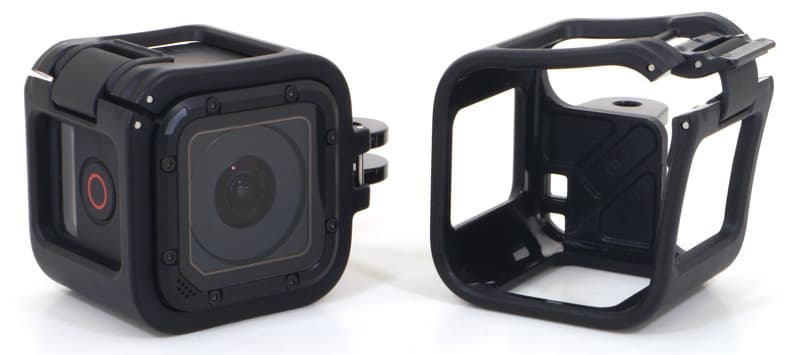 Новый дизайн корпуса подразумевает и новый тип крепления. Теперь для того, чтобы закрепить камеру на штативе, присоске, липучке и т. д., ее следует поместить в специальный пластиковый каркас и зафиксировать защелкой. Благодаря кубической форме, камеру можно повернуть и развернуть в креплении как угодно — довольно продуманный шаг со стороны разработчика.