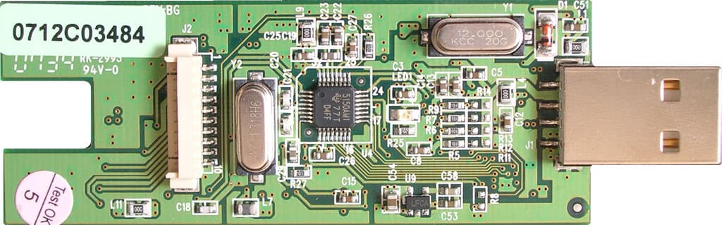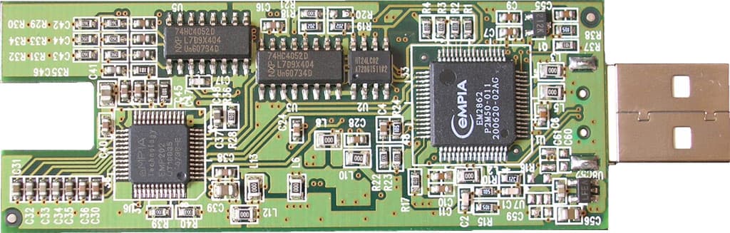 Ключевым элементом на этой стороне платы является чип USB 2.0 аудио/видео-контроллера EM2862 от EMPIA Technology. Среди его функций нет аппаратного сжатия видеосигнала, поэтому наша ранее высказанная догадка об использовании для сжатия видеосигнала центрального процессора компьютера получает подтверждение. Небольшой чип слева от EM2862 — это HT24LC02, постоянное запоминающее устройство (ПЗУ) c последовательным двухпроводным интерфейсом, содержащее в себе встроенное программное обеспечение. Немного в стороне от этих чипов размещен двухканальный 20-битный чип-кодек AC’97 — EMP202 от этой же фирмы, отвечающий за передачу звука. Также здесь размещены два мультиплексора аналоговых сигналов 74HC4052D.