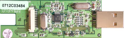 С обратной стороны — две наклейки (с серийным номером и гарантийной пломбой). Вес «Grand AV USB 2.0 Pro» невелик, но достаточен, чтобы из вертикально расположенного USB-разъема произошло самопроизвольное отключение устройства под действием собственного веса устройства. С горизонтально расположенными USB-портами таких проблем нет.