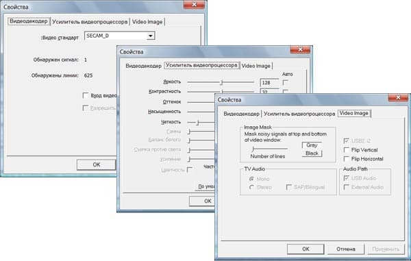 Эта позиция означает, что драйвер установлен корректно, и можно начинать работу. Драйвер предоставляет нам следующие настройки, доступные из любого программного обеспечения для видеозахвата: