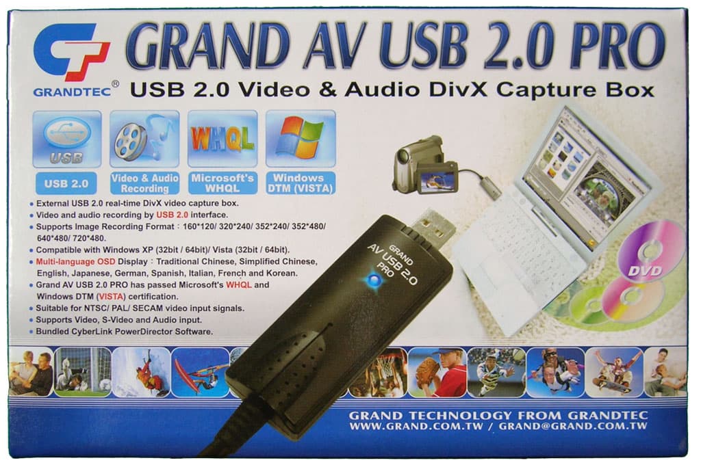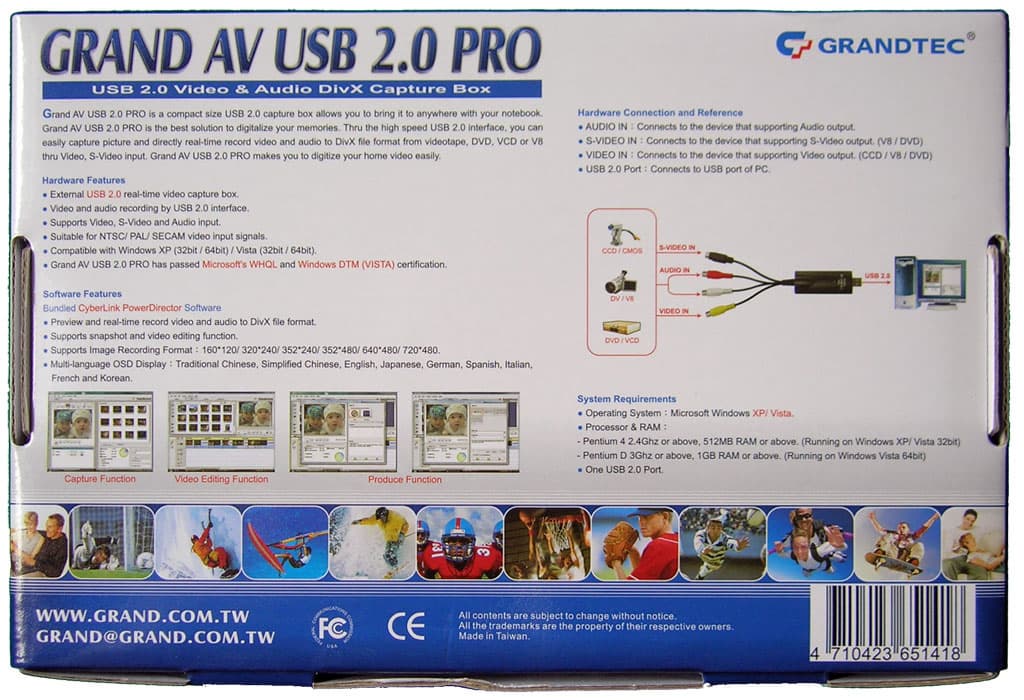 Вольный и немного сокращенный перевод рекламного слогана, напечатанного на коробке: «Grand AV USB 2.0 Pro» — это небольших размеров USB 2.0 устройство, способное с легкостью захватить видео в реальном времени на ваш ноутбук».