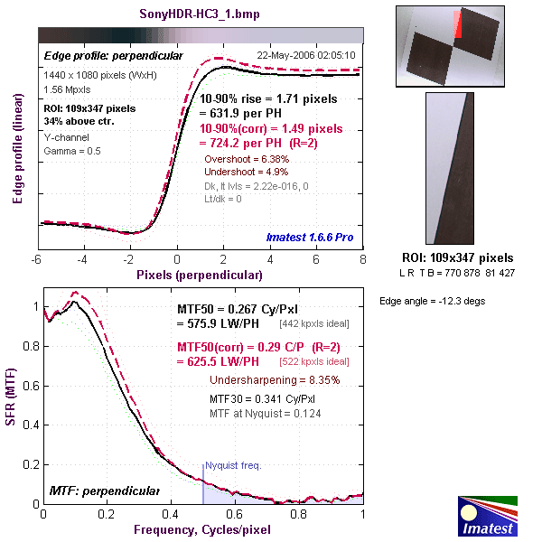 Верхний график представляет собой краевой профиль, для которого приведено значение 10-90% rise distance в пикселях, а нижний график представляет собой MTF (Modular Transfer Function функция передачи модуляции), для которой приведен параметр MTF50 в циклах на пиксель. Краевой профиль и MTF камеры показаны черной линией. Красной пунктирной линией обозначен краевой профиль и MTF, которые программа Imatest считает близкими к оптимальным. 10-90% rise distance и MTF50 также являются расчетными величинами Imatest.
