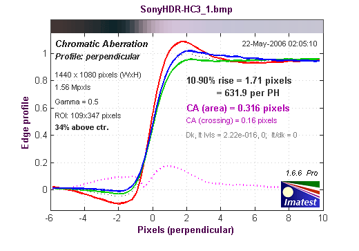 График хроматической аберрации (на самом деле, это тот же краевой профиль, только построенный по каждому цвету в отдельности). При значении параметра CA (area) равным 0-0.5 хроматическая аберрация не заметна. Хотя здесь мы видим, что краевой профиль у R кривой гораздо резче, чем у B и G. Тем самым слегка завышено присутствие красного цвета. Это можно заметить на линейке градаций в верхней части графика.