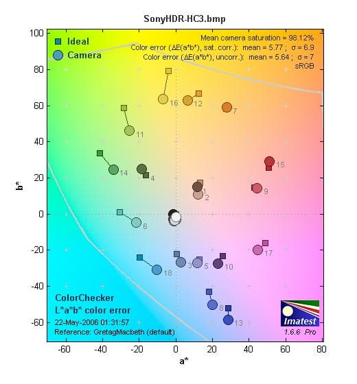 На следующей диаграмме в графической форме представлены отклонения зарегистрированных камерой цветов от идеала в цветовом пространстве CIE LAB.
