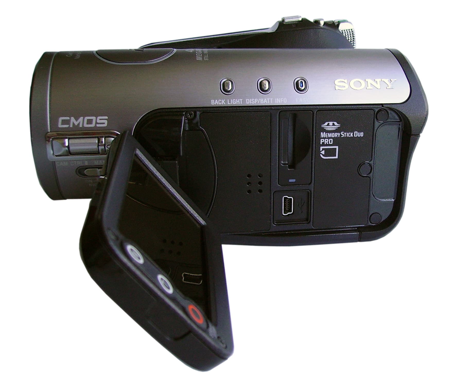 Под откидывающимся экраном разместился слот для двух типов карт памяти: Memory Stick Pro и Memory Stick Duo со светодиодным индикатором доступа. Ниже, соответственно, разъем mini-USB. Здесь же, на боковой панели, находится и встроенный динамик. Никаких лишних кнопок все управление камерой отдано пульту дистанционного управления и чувствительному к нажатиям ЖК-экрану.